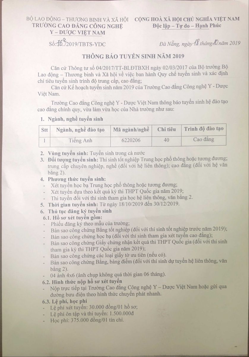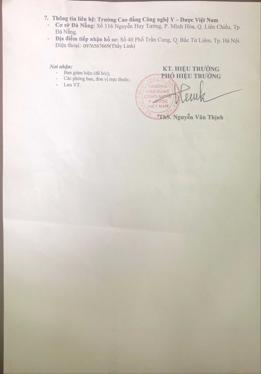 Địa chỉ tiếp nhận hồ sơ: Trường Cao Đẳng Công Nghệ Y - Dược Việt Nam
